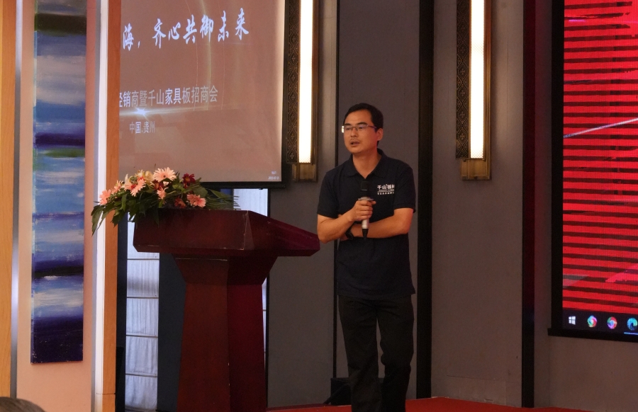 千山南大區負責人滿彬與大家分享并解讀了家具板的發展趨勢,闡述了未來3-5年千山全國分倉的設立和布局,打造區域總倉和副倉,統籌兼顧,解決不同地域消費習慣對板材品類的多樣需求。