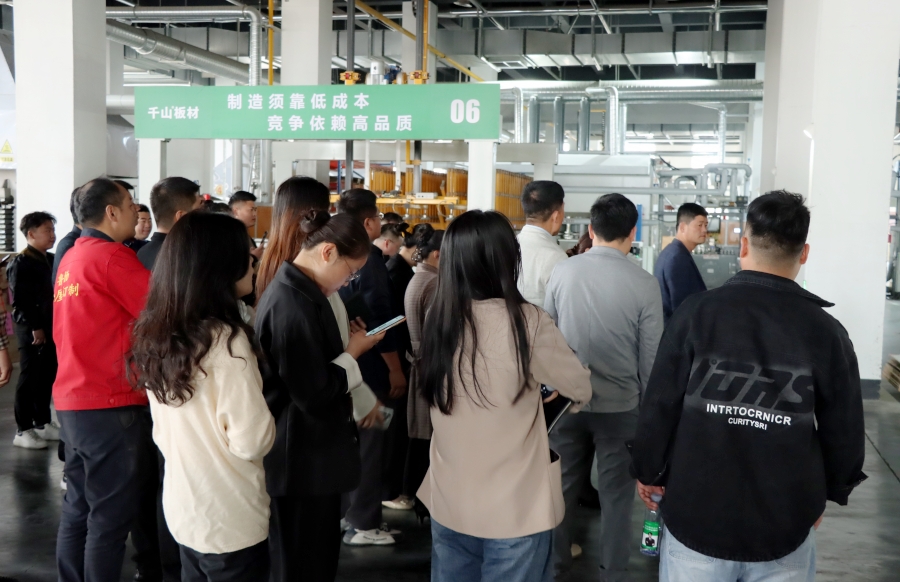 學習會結束后,王殿忠經理帶領大家參觀了千山的現代化生產工廠,從板材品類、生產工序、檢驗出廠等方面深入了解板材生產環節。