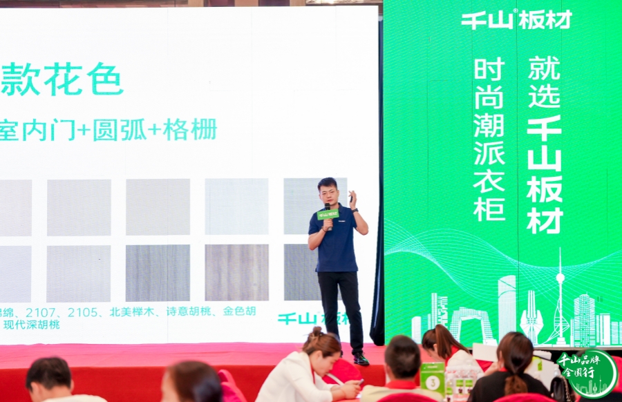 市場競爭瞬息萬變,產品思路尤為關鍵。千山板材西安倉肖經理、門墻柜產品負責人代總,分別從家裝設計趨勢、設計案例、門墻柜一體化應用等方面詳細闡述了西安倉的產品競爭優勢。
