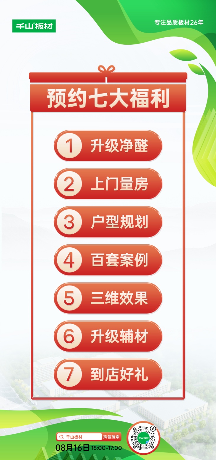 千山板材全國線下門店將為您提供卓越的支持和幫助,讓我們一起FUN心購!8月16日-9月16日,鎖定千山板材官方直播間,享多重家裝好禮!