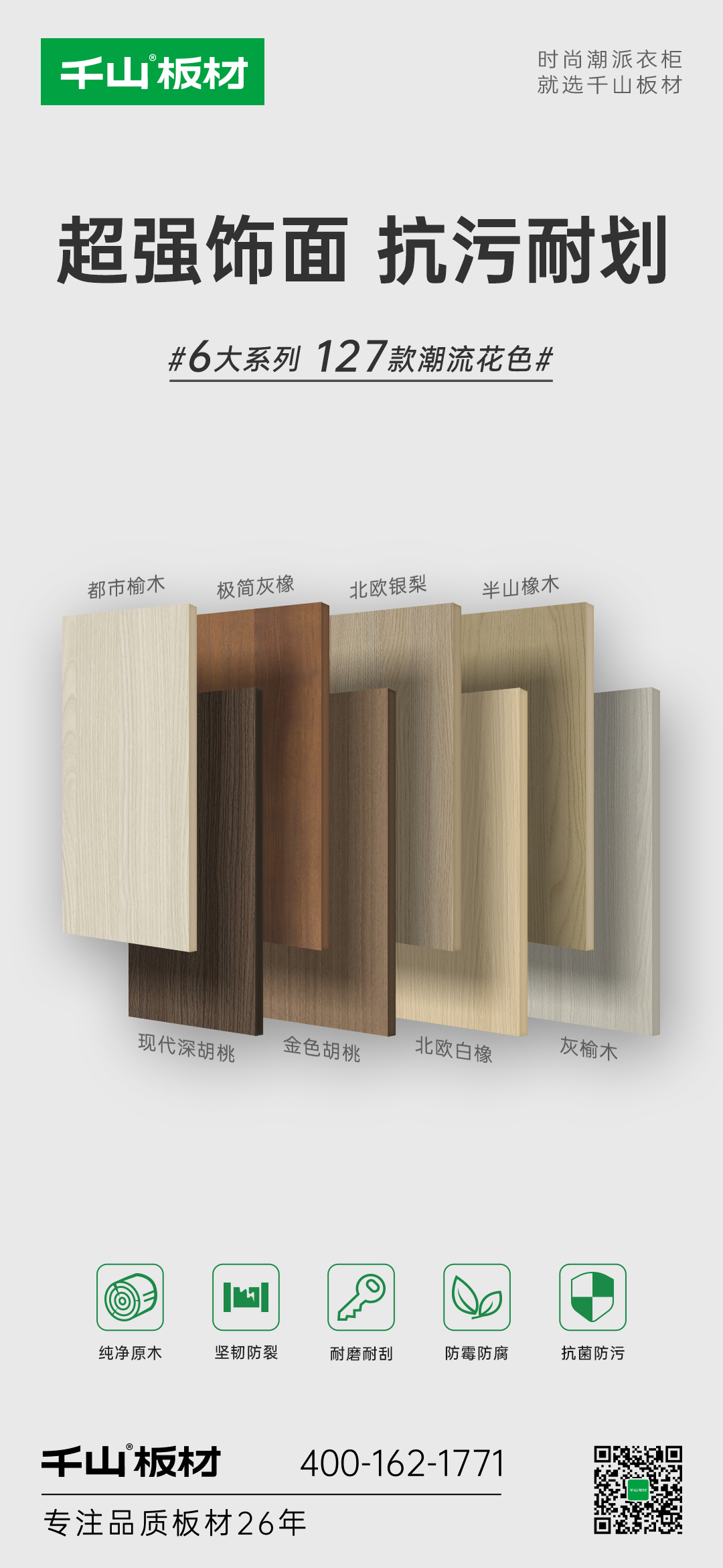 6大系列127款潮流花色涵蓋木紋系列32款、純色系列41款、高定系列10款、數碼系列24款、布紋石紋系列8款、門板系列12款,滿足多樣化的裝修風格。