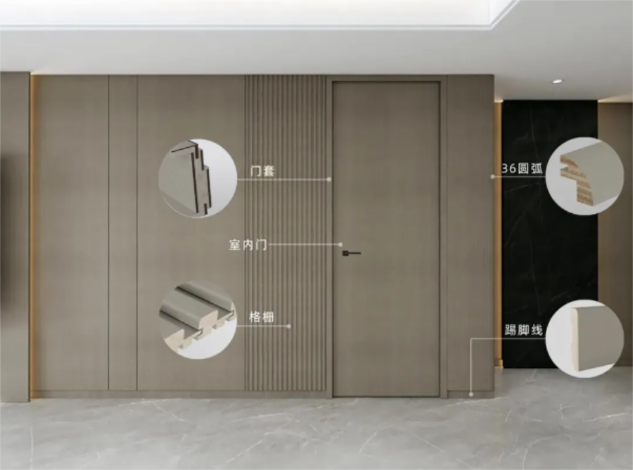 門墻柜系統(tǒng)涵蓋板材、室內(nèi)門、圓弧、實(shí)木格柵、埡口、門套線、踢腳線,打通23款花色,材質(zhì)、色彩統(tǒng)一,實(shí)現(xiàn)門墻柜全屋同色一體。