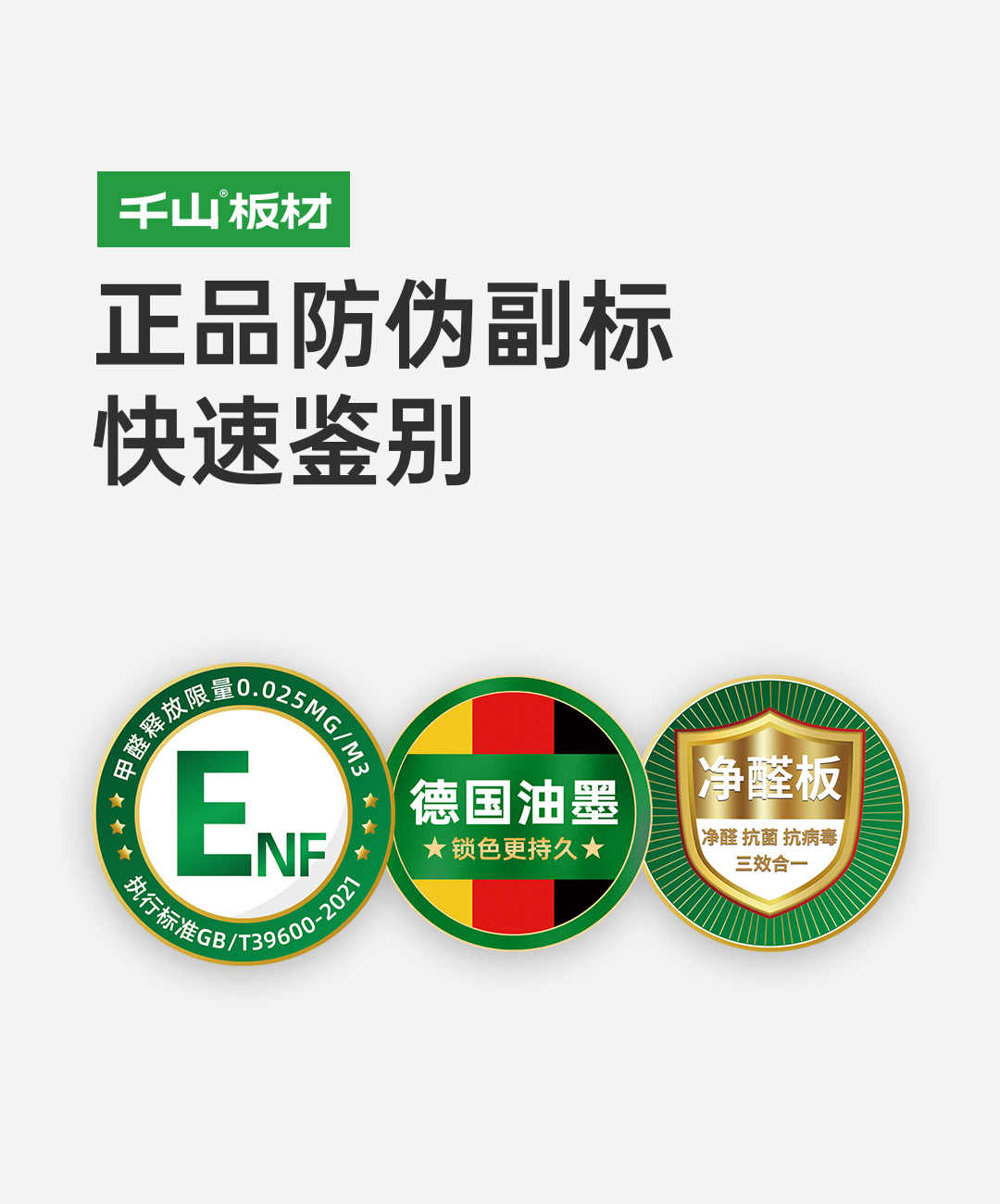 正品千山板材表面都印有隱形防偽標識,使用紫光手電筒照射板材表面,顯現(xiàn)“千山板材” 或 “千山板材ENF”水印,凈醛板顯現(xiàn)“凈醛 抗菌 抗病毒”水印。