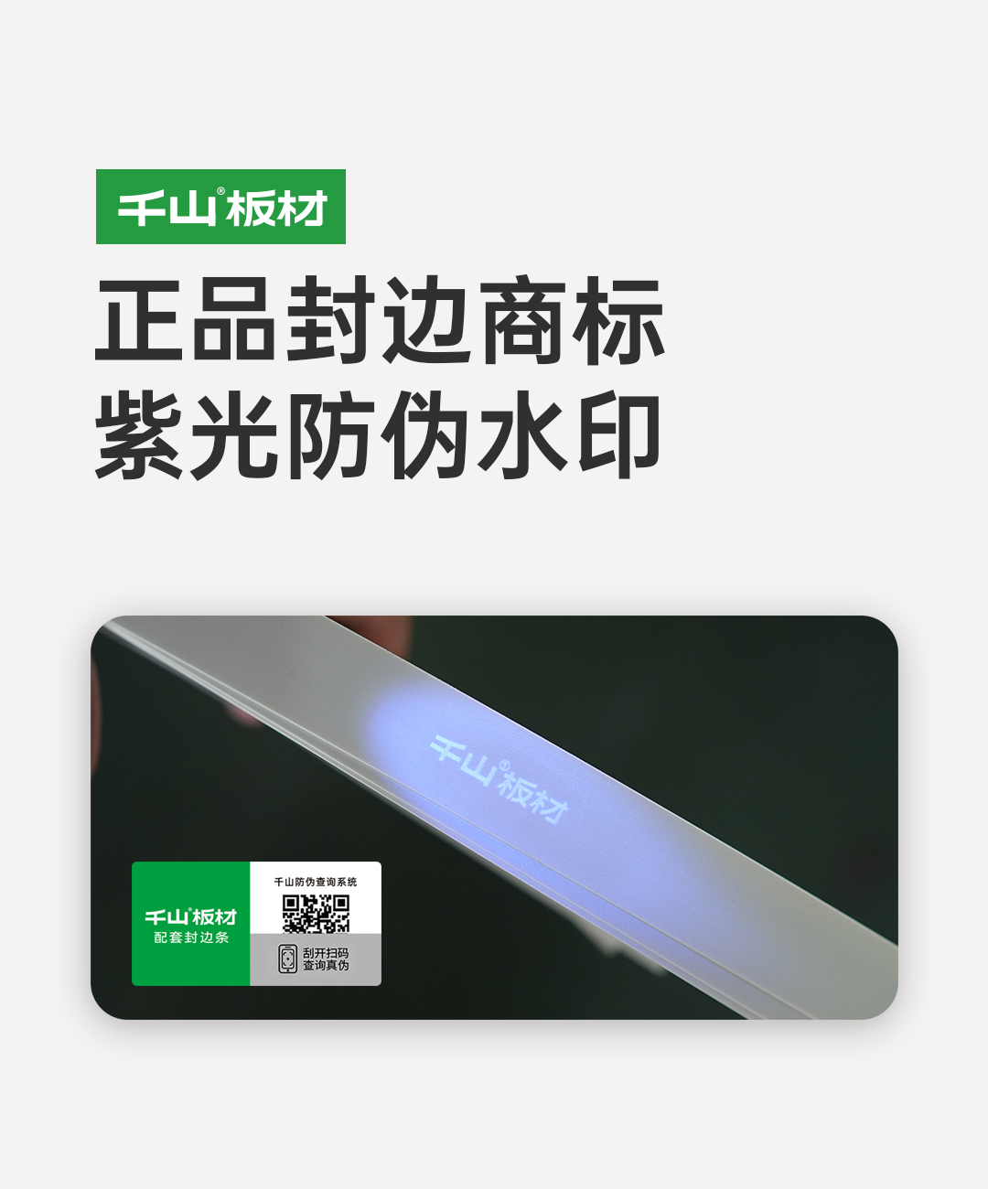 正品配套封邊皮有千山板材防偽商標,刮開圖層后可掃碼查詢真?zhèn)危?/span>用紫光照射查驗,顯示“千山板材”防偽水印。