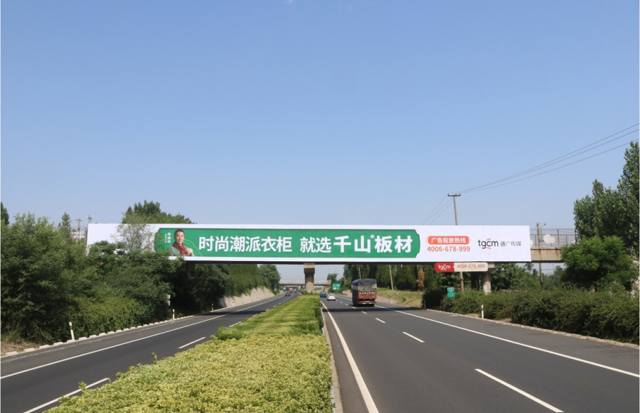 近日,千山在山東省重點高速路段投放14座跨線橋和立柱媒體廣告,再次橫跨山東省內(nèi)多條主干線,如泰新高速、京臺高速、日蘭高速、青銀高速等,覆蓋山東省及其他省市區(qū)域。高速廣告形式依舊涵蓋跨線橋、單立柱等,廣告畫面鮮艷,以綠色為主色調(diào),可視距離美觀、簡潔,進一步將“時尚潮派衣柜 就選千山板材”的品牌主張傳遞給更多的消費